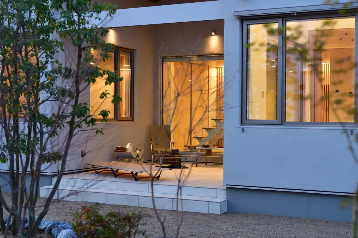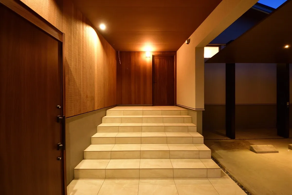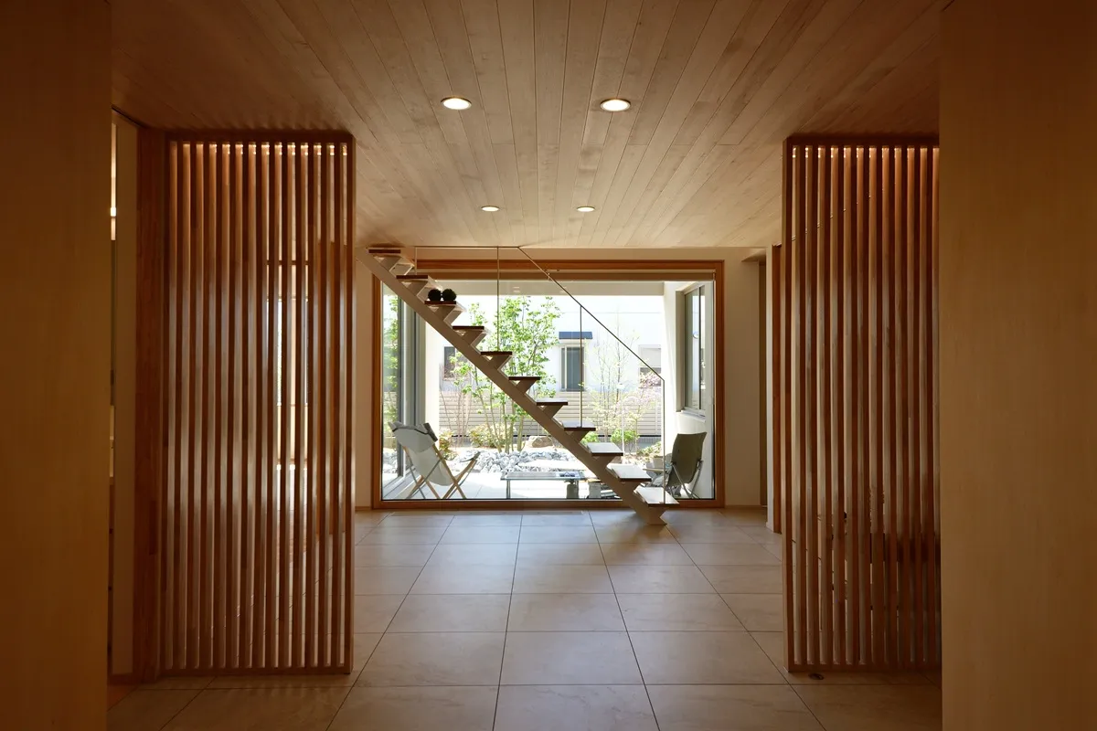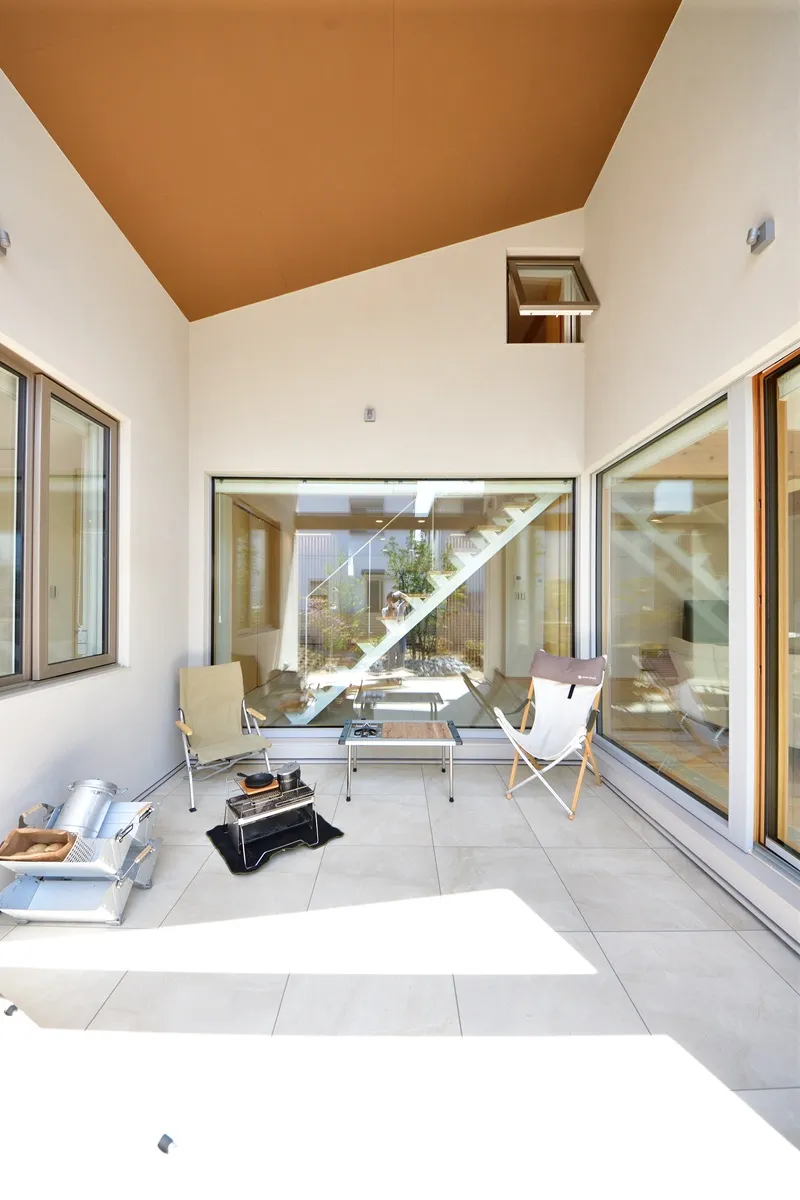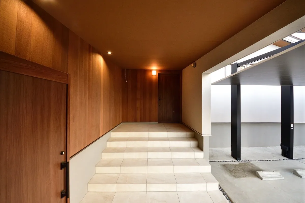 雨の日や日差しが強い真夏でも、お庭での家族時間を過ごせるコートハウスがある住まい。屋根付きのコートハウスはタイル張りで使い勝手が良く、特注サイズの大きな木製サッシで室内とシームレスに繋がります。玄関からコートハウスまで繋がるホテルライクな玄関ホールが魅力です。
