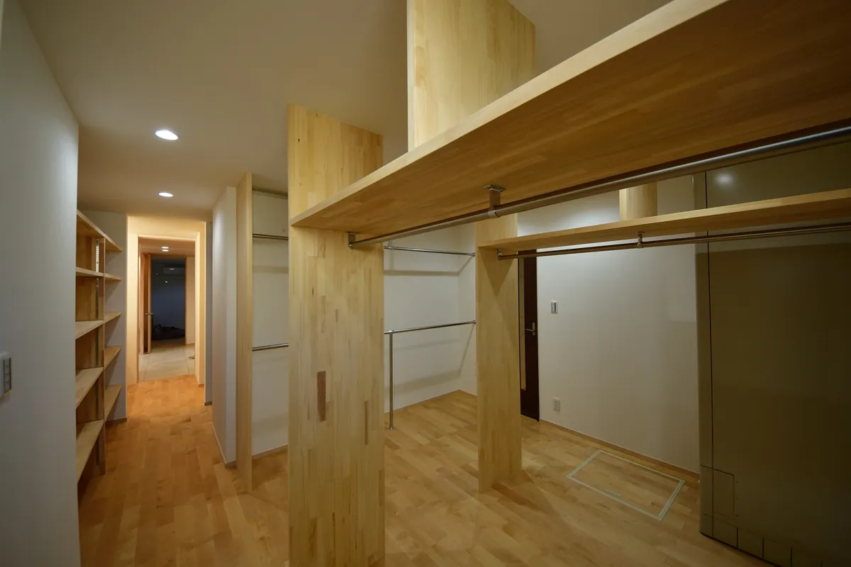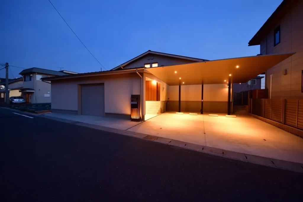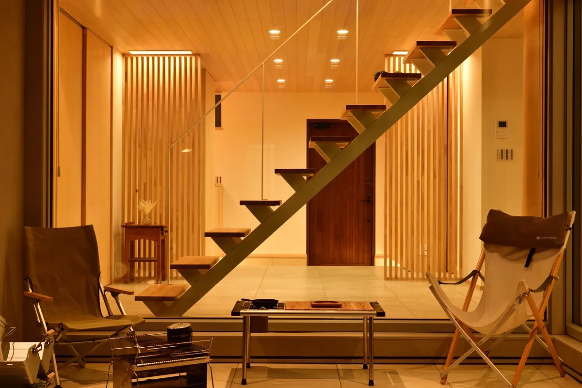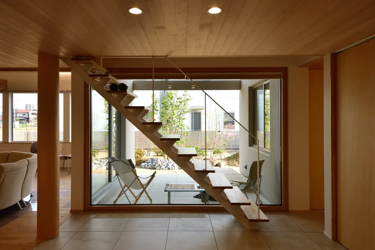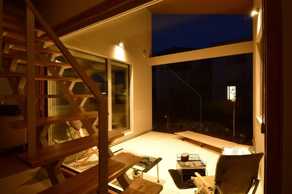 雨の日や日差しが強い真夏でも、お庭での家族時間を過ごせるコートハウスがある住まい。屋根付きのコートハウスはタイル張りで使い勝手が良く、特注サイズの大きな木製サッシで室内とシームレスに繋がります。玄関からコートハウスまで繋がるホテルライクな玄関ホールが魅力です。