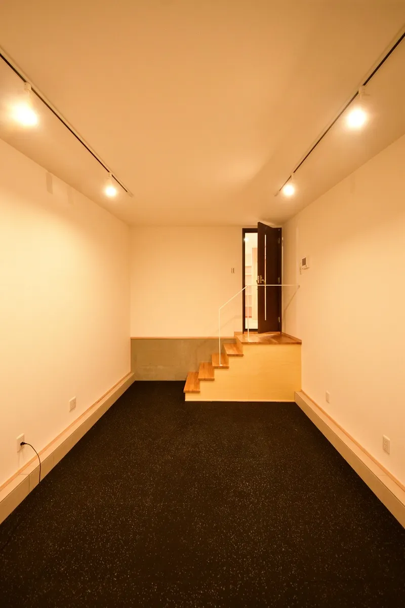 約70坪の建物でありながら、街に圧迫感を与えない平屋風の外観を意識しました。インナーガレージと後付けカーポートの高さを合わせ、低い軒のラインをつくることで、建物の重心を低く見せています。幅のある玄関ホールに重厚感を持たせるために、600角の大きめのタイル張りとレッドシダーの板張りでデザインしました。