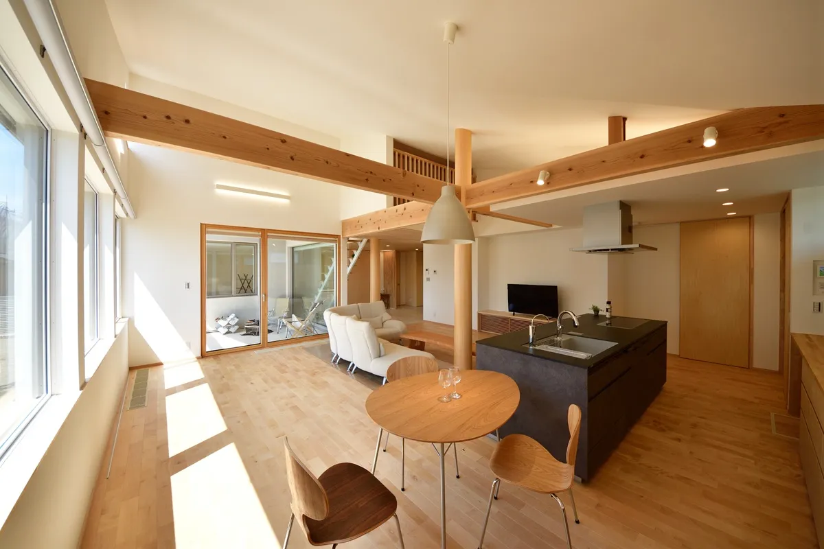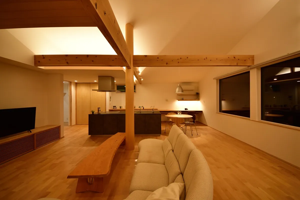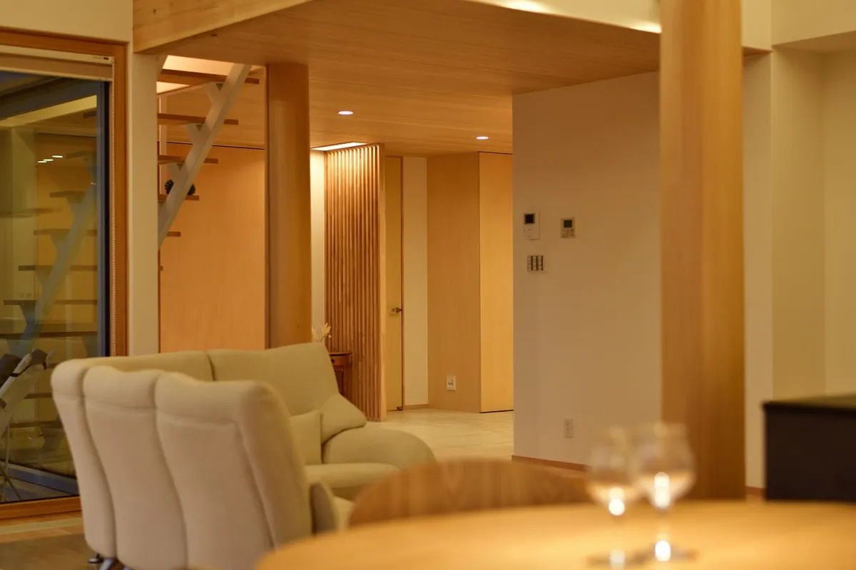 玄関からコートハウスを抜けて庭まで繋がる、ホテルライクな玄関ホールが魅力です。庭までの視界がシームレスになるように、特注サイズの木製サッシを採用しました。丸太柱を中心に広がるLDKはゆったりと広さをとり、間接照明で落ち着く空間を演出しています。