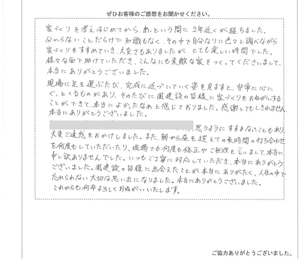 様々な面で助けていただき、こんなにも素敵な家をつくってくださいまして、本当にありがとうございました。