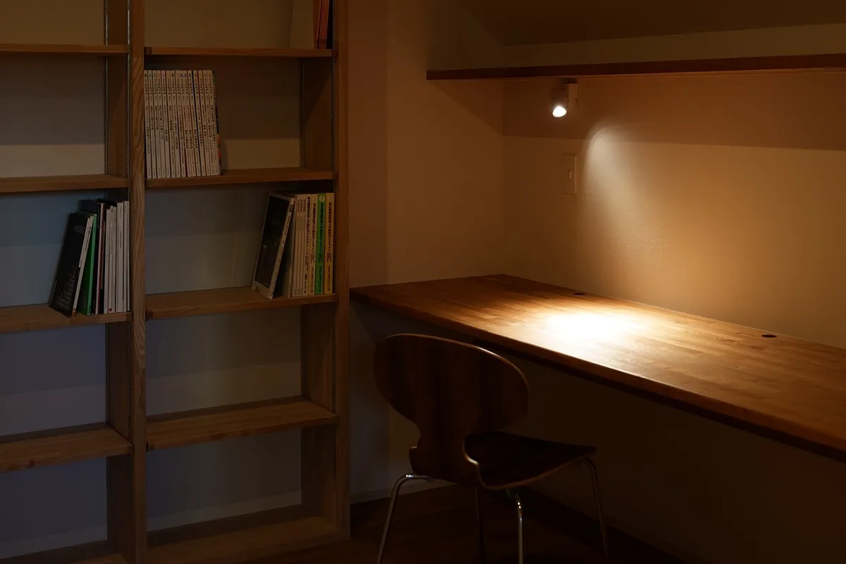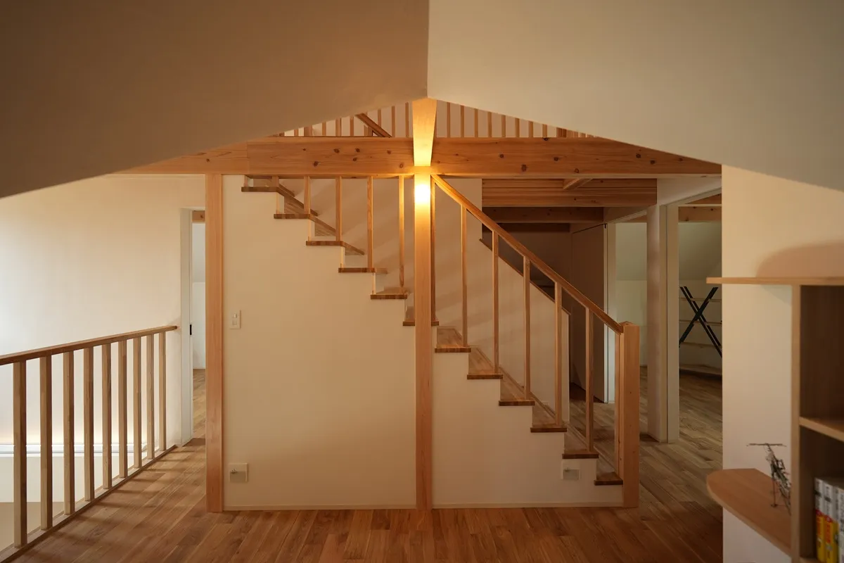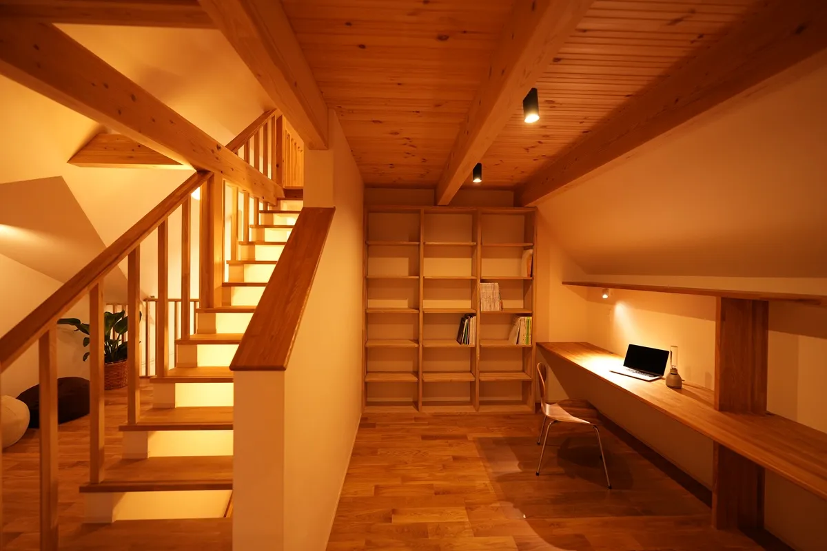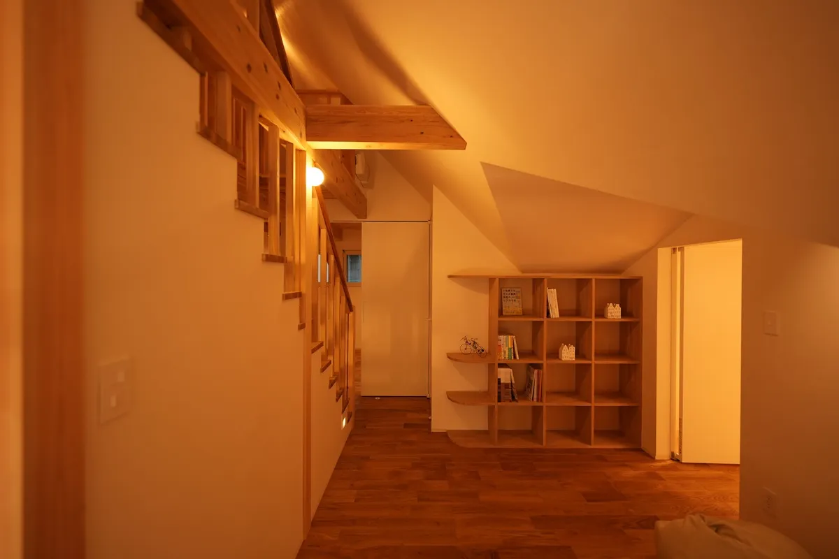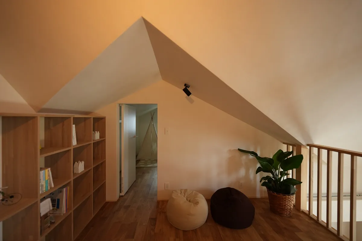 シンボル的な三角屋根はその形を活かしてリズム感のある室内空間を演出しています。吹き抜けの窓から入る優しい光が天井に反射して柔らかい光の屈折が心地良いです。お仕事柄、そして教育方針から本がとても多いご家族ということで、お家の至る所に本棚を設けています。家中が快適な温湿度なので、どこにいてもゆったり自分の時間を過ごせます。