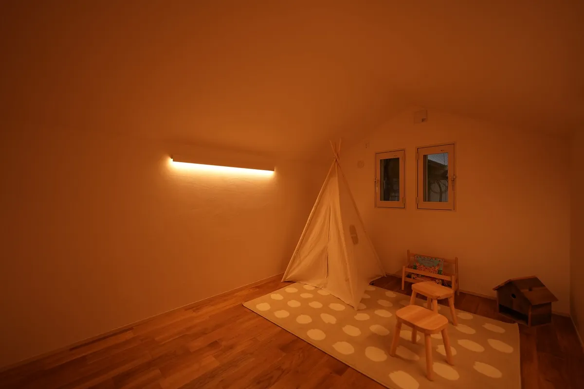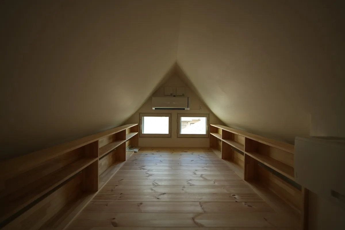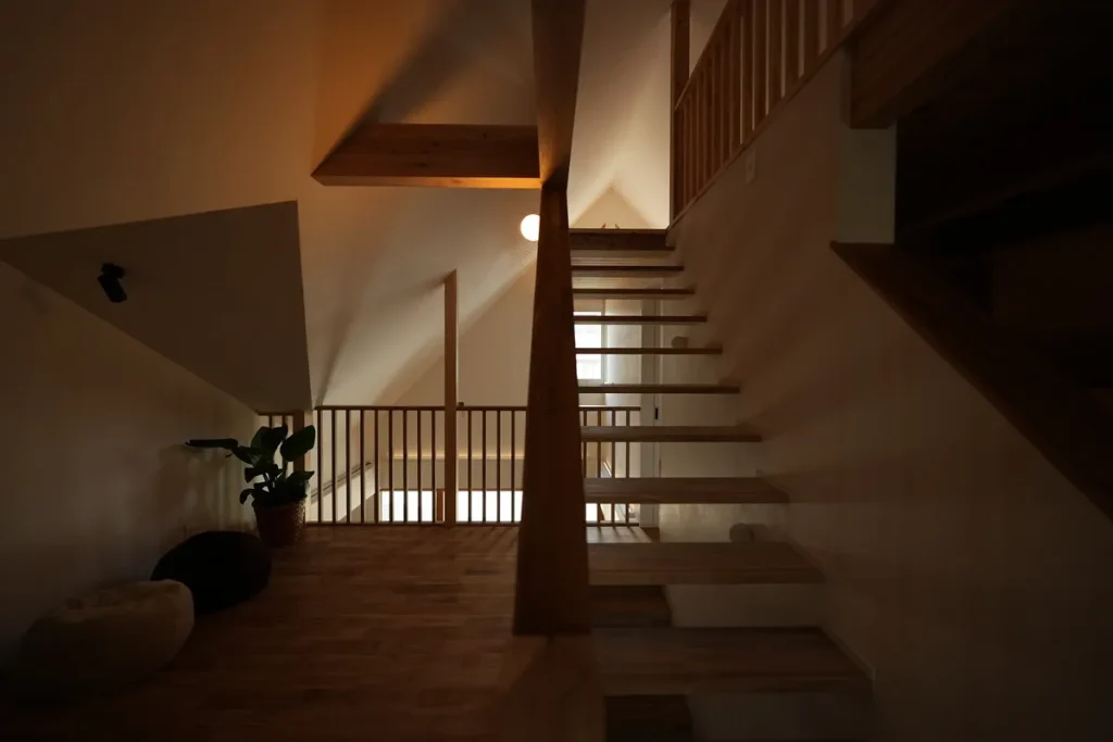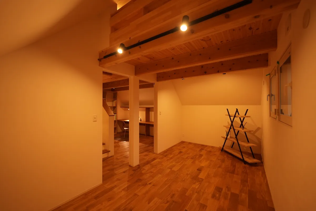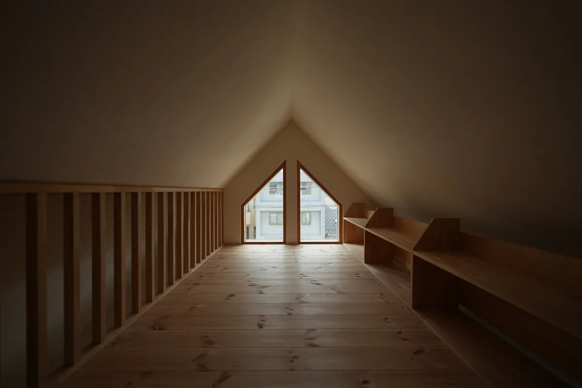シンボル的な三角屋根はその形を活かしてリズム感のある室内空間を演出しています。吹き抜けの窓から入る優しい光が天井に反射して柔らかい光の屈折が心地良いです。お仕事柄、そして教育方針から本がとても多いご家族ということで、お家の至る所に本棚を設けています。家中が快適な温湿度なので、どこにいてもゆったり自分の時間を過ごせます。