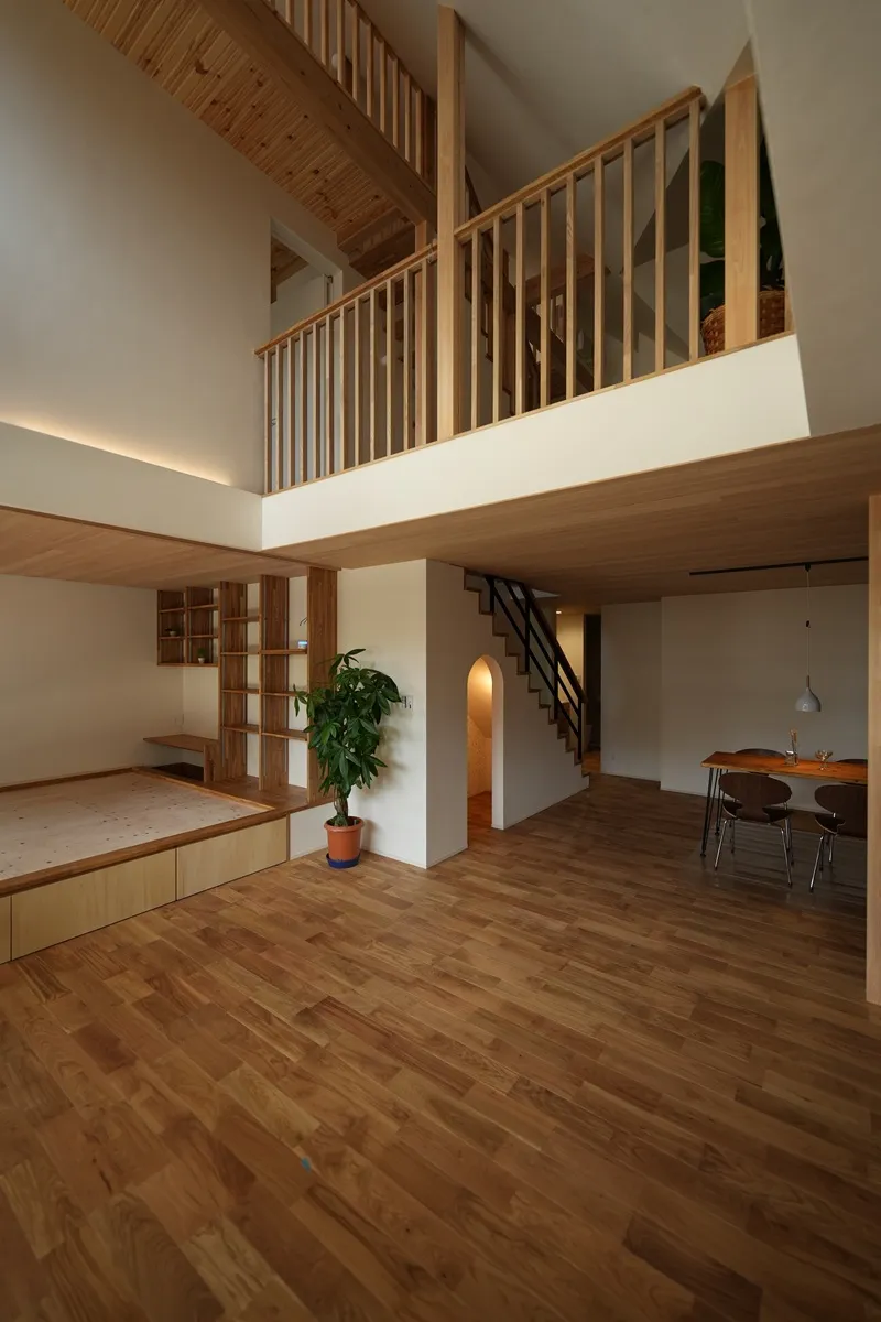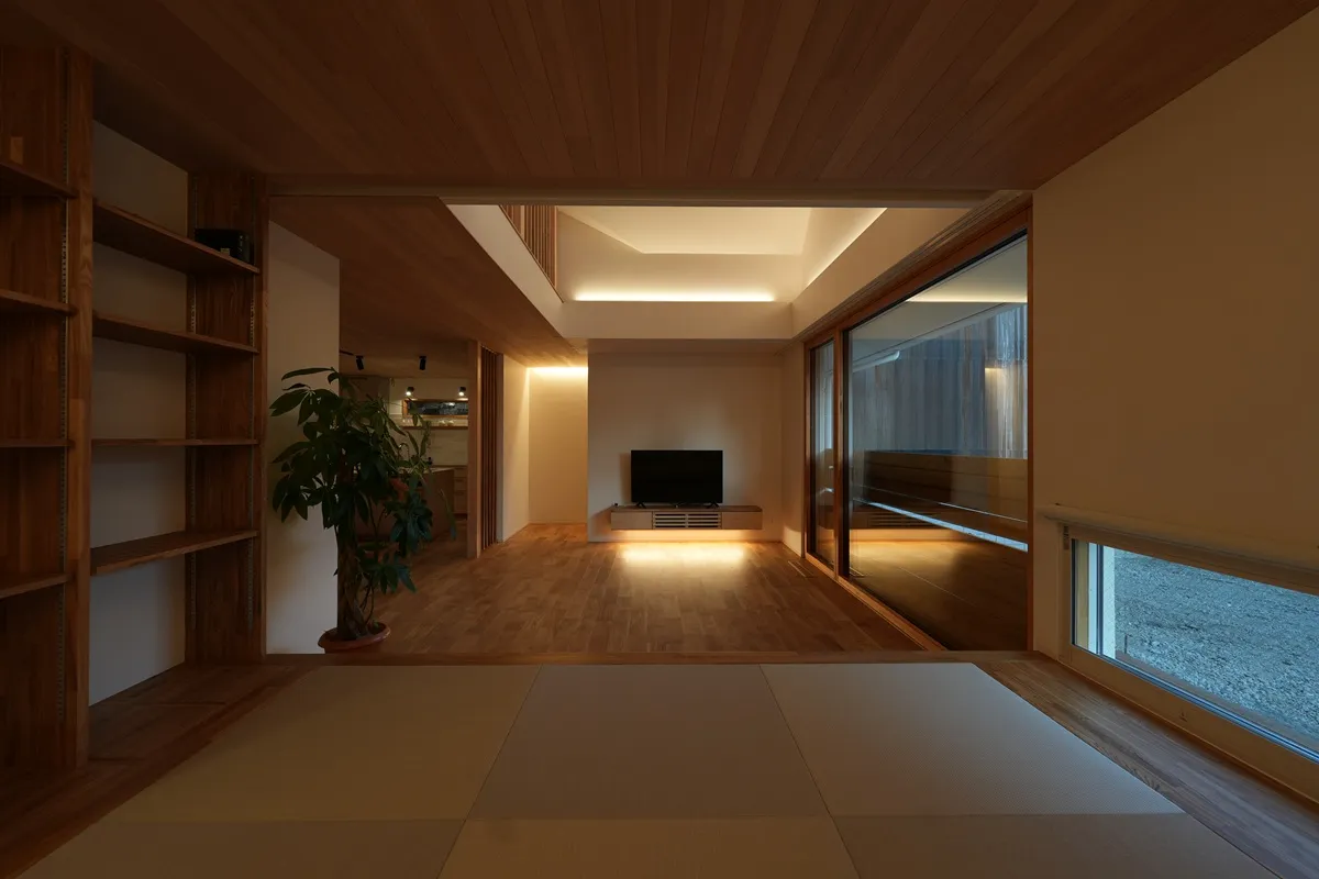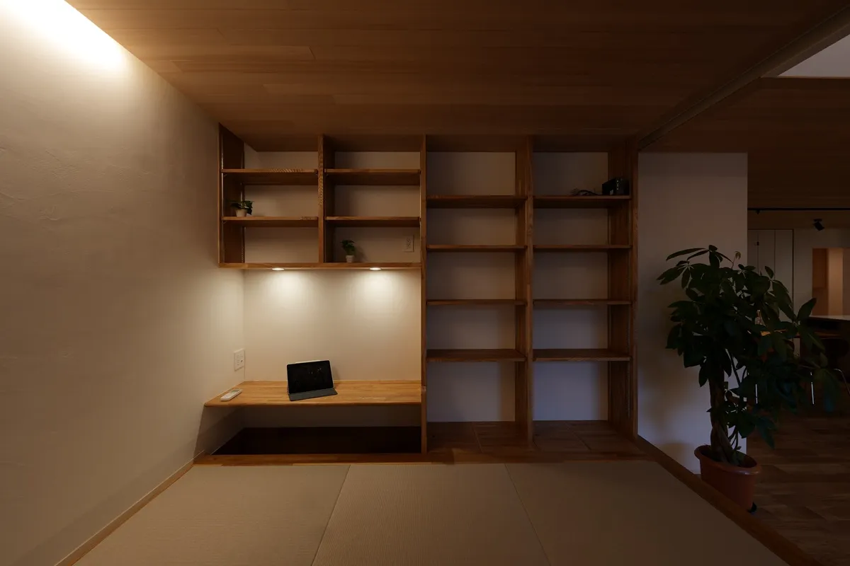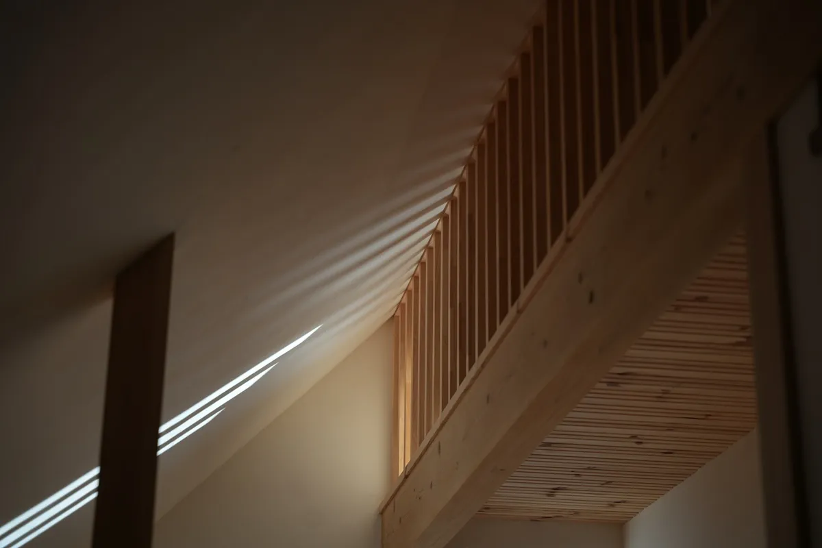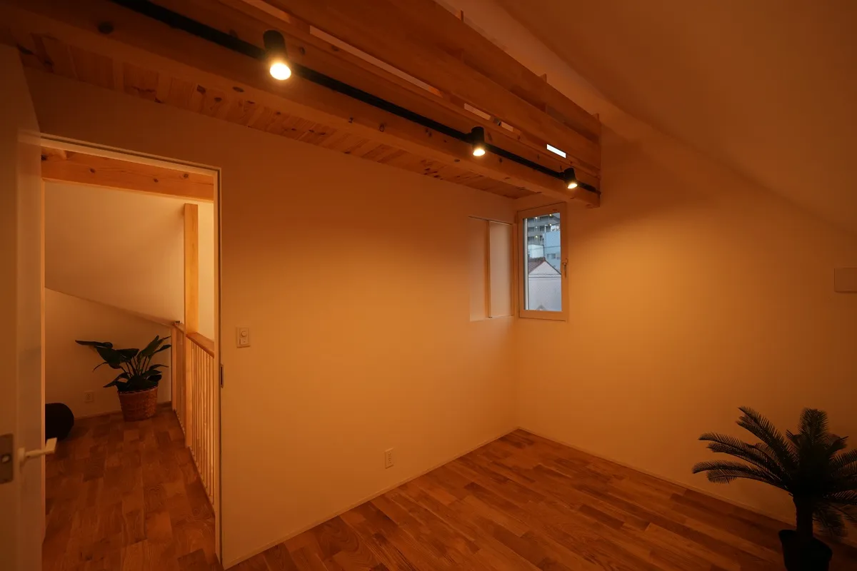 シンボル的な三角屋根はその形を活かしてリズム感のある室内空間を演出しています。吹き抜けの窓から入る優しい光が天井に反射して柔らかい光の屈折が心地良いです。お仕事柄、そして教育方針から本がとても多いご家族ということで、お家の至る所に本棚を設けています。家中が快適な温湿度なので、どこにいてもゆったり自分の時間を過ごせます。
