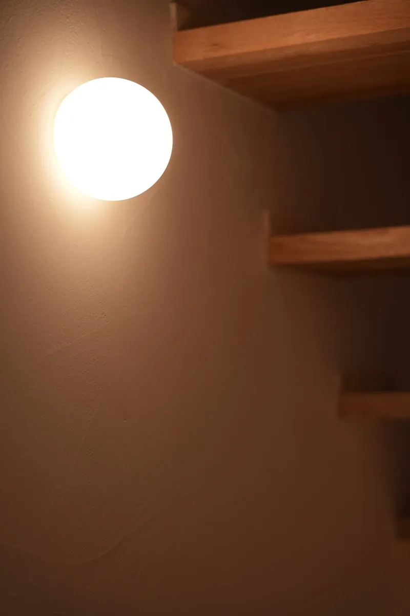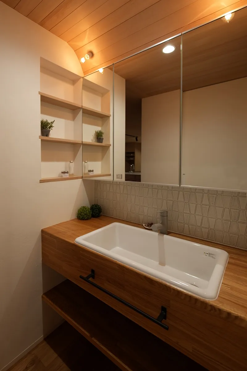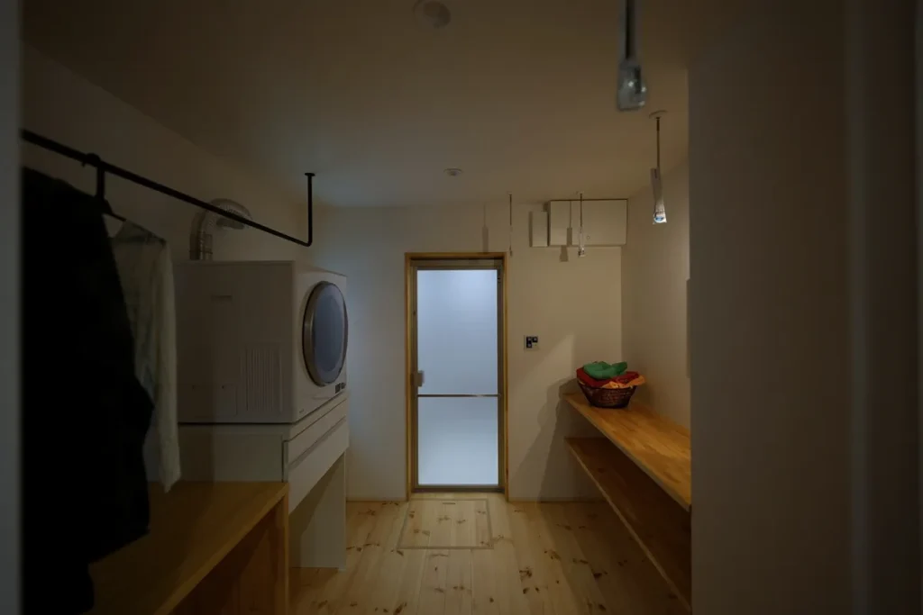内装のメインはナラの無垢床を貼っていますが、脱衣室だけは針葉樹のパインを採用しています。広葉樹よりも足触りが柔らかく、吸水性も良い針葉樹の無垢床は、お風呂上がりの濡れた足で歩いてもサラッと優しくとても気持ち良いです。敢えて節のある材を選ぶことで、水染みを気にしすぎることなく暮らしていただけるのもポイントです。
