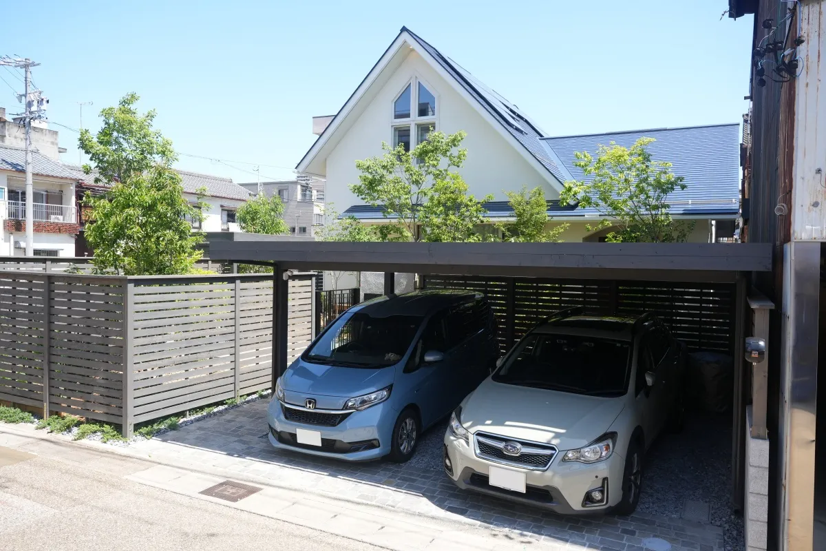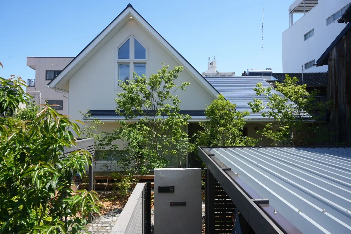 三角屋根と造作の台形窓が特徴的な可愛らしい外観です。お庭のグリーンが映えるホワイトの塗り壁とブルーの屋根が爽やかな印象です。街中でありながら、大開口の木製サッシから繋がる緑豊かなお庭は暮らしに彩りを添えてくれます。