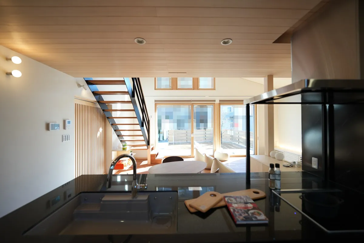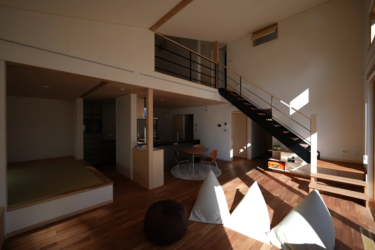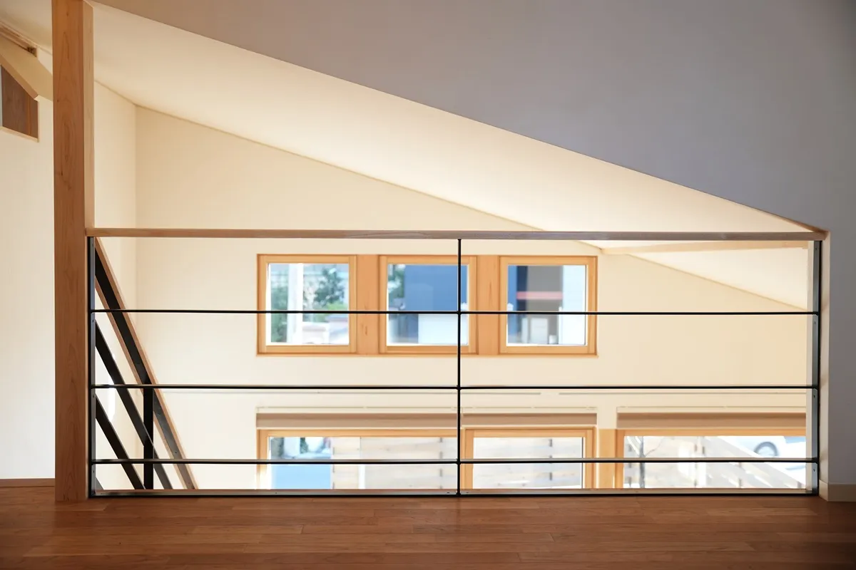 木製サッシ「佐藤の窓」が映えるスタイリッシュな内観です。木の家に馴染む、高い日射取得性能、窓枠の断熱性能、そして将来のメンテナンス性が考慮された窓はこの住まいに必要不可欠なパーツです。階段手摺はアイアンの細いラインで構成され、お部屋を開放的に見せてくれます。