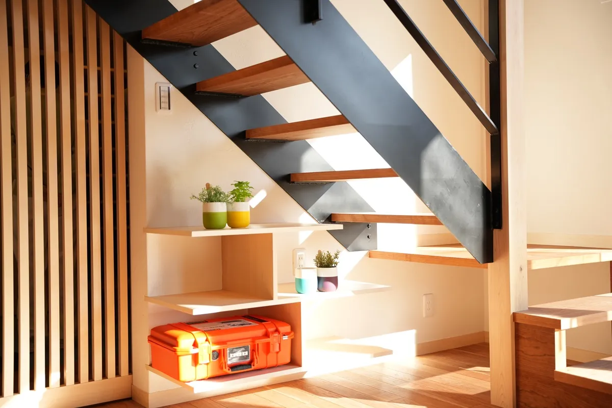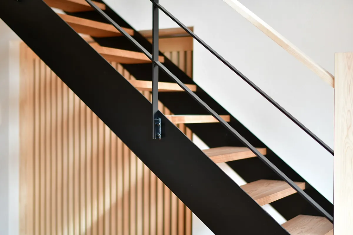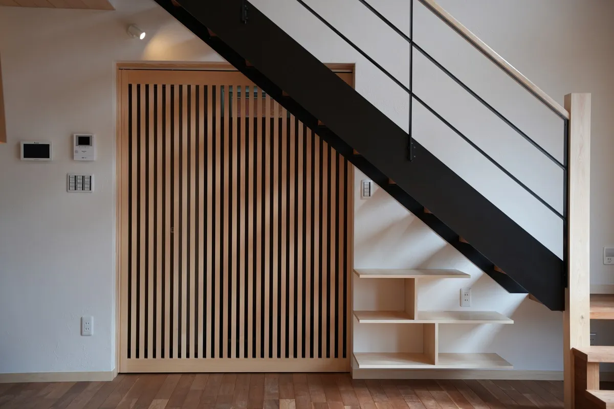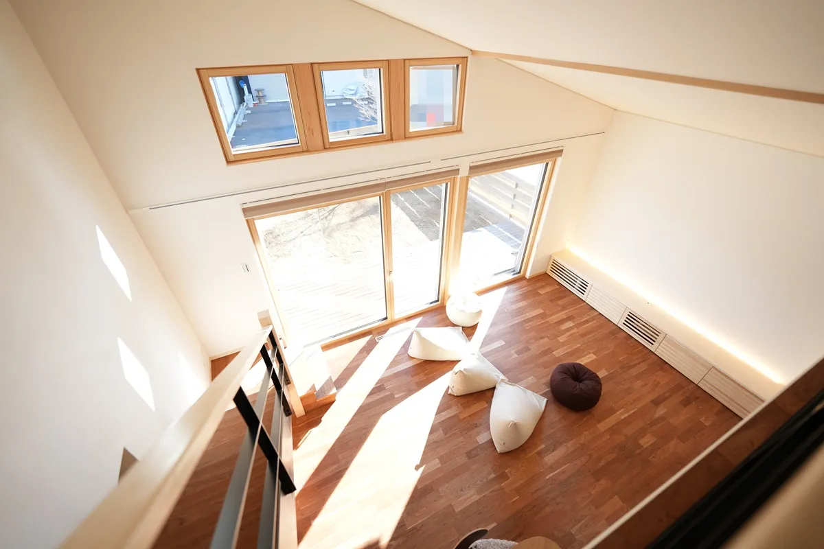 木製サッシ「佐藤の窓」が映えるスタイリッシュな内観です。木の家に馴染む、高い日射取得性能、窓枠の断熱性能、そして将来のメンテナンス性が考慮された窓はこの住まいに必要不可欠なパーツです。階段手摺はアイアンの細いラインで構成され、お部屋を開放的に見せてくれます。