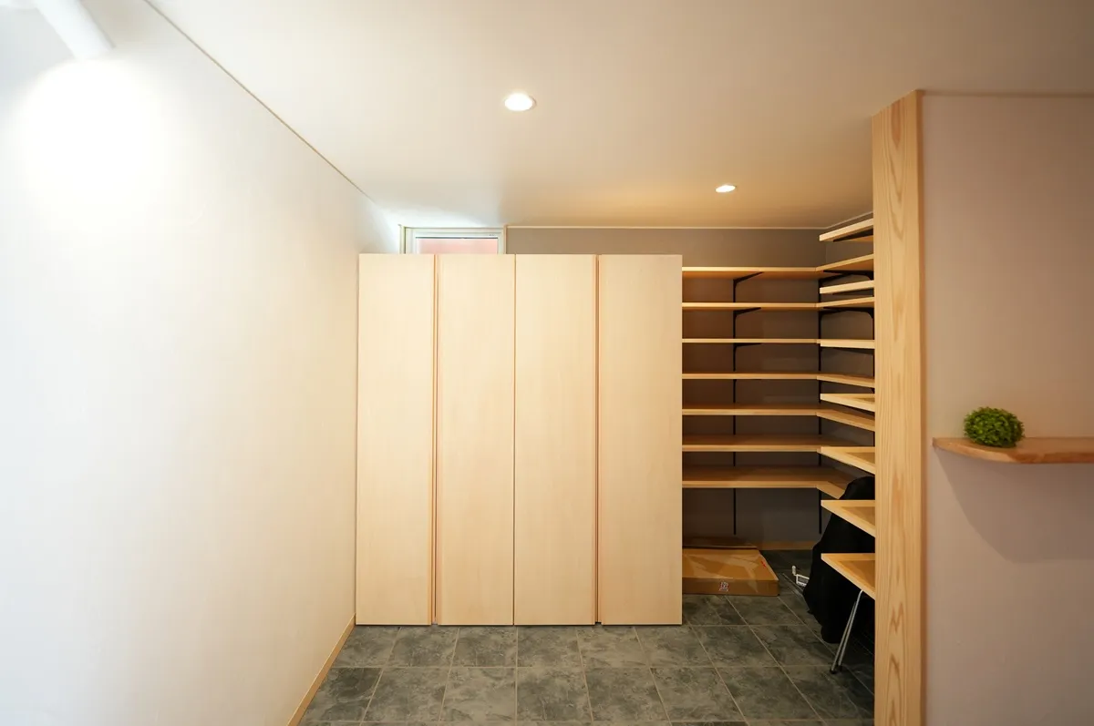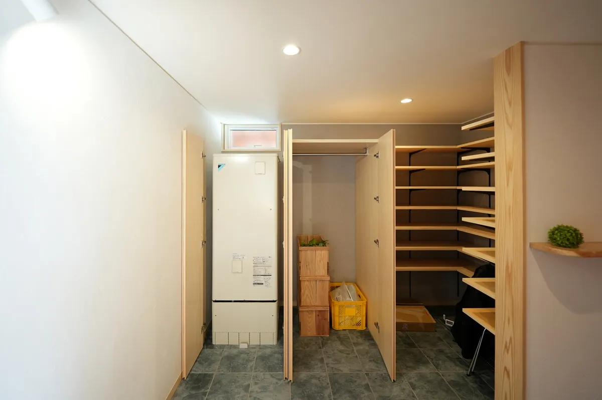 アウトドアの趣味が多いお施主様に、気兼ねなく使える土間収納をたっぷりご提案しました。その一角にはエコキュートのタンクを設置しています。冬季のお湯が冷めにくく省エネな使い方ができる上、お湯が冷める時に放出される熱が暖房の役割も担ってくれます。また、温熱環境が安定している室内に置いてあるとタンクの長寿命化にも繋がります。