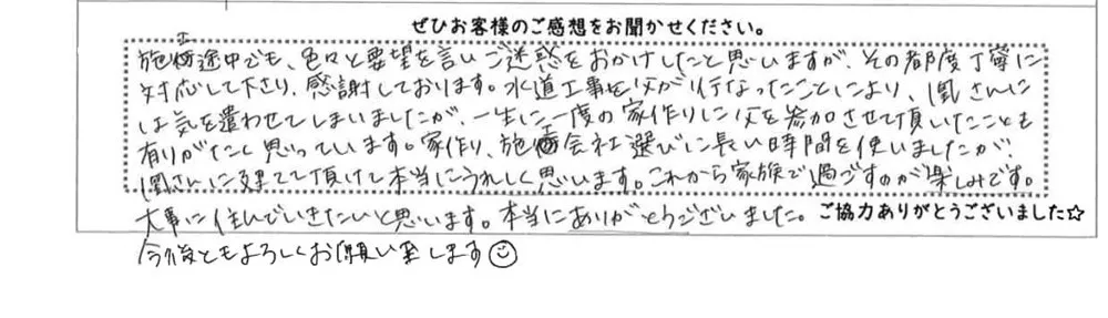 施工途中でも、色々と要望を言いご迷惑をおかけしたと思いますが、その都度丁寧に対応して下さり、感謝しております。水道工事を父が行ったことにより、凰さんには気を遣わせてしまいましたが、一生に一度の家づくりに父を参加させて頂いたことを有りがたく思っています。家づくり、施工会社選びに長い時間を使いましたが、凰さんに建てて頂けて本当にうれしく思います。これから家族で過ごすのが楽しみです。大事に住んでいきたいと思います。本当にありがとうございました。