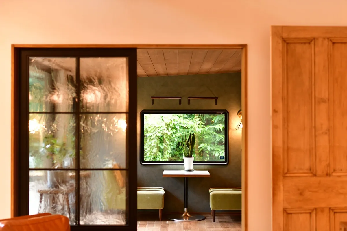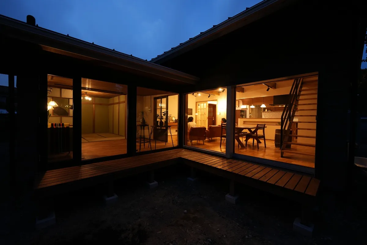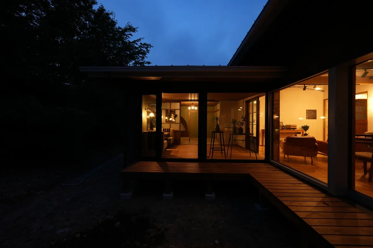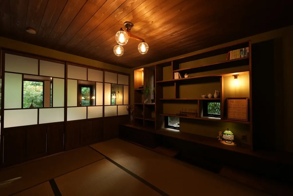 カリフォルニアスタイルにOzashikiあり。畳の落ち着ける部屋が欲しいとのご要望で、Green Roomを干渉空間に置くことで各所のバランスを取りました。Livingとの対比で天井高さを低く抑えることでOzashikiがよりこもり感のある、座の空間になっています。間仕切りの建具は古建具を購入して大工さんのリメイクで取り付けました。