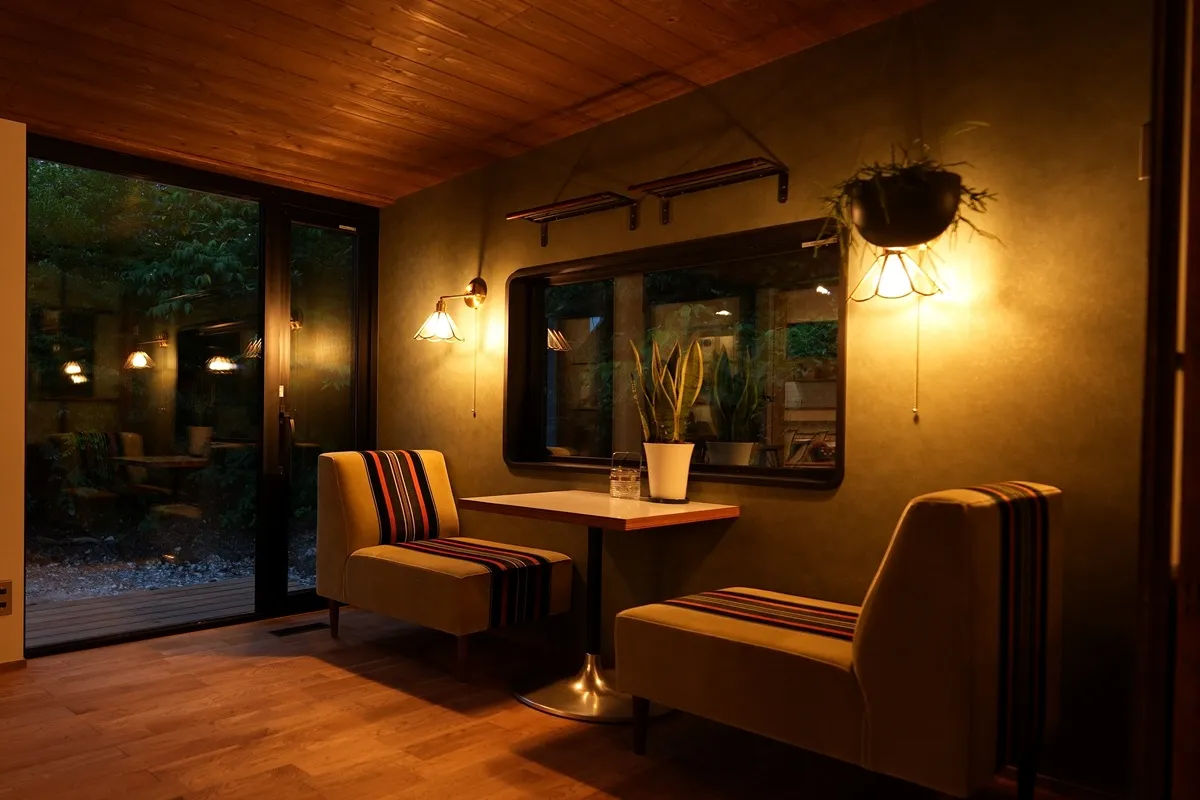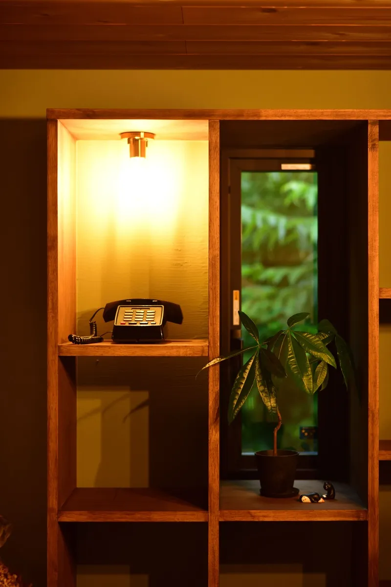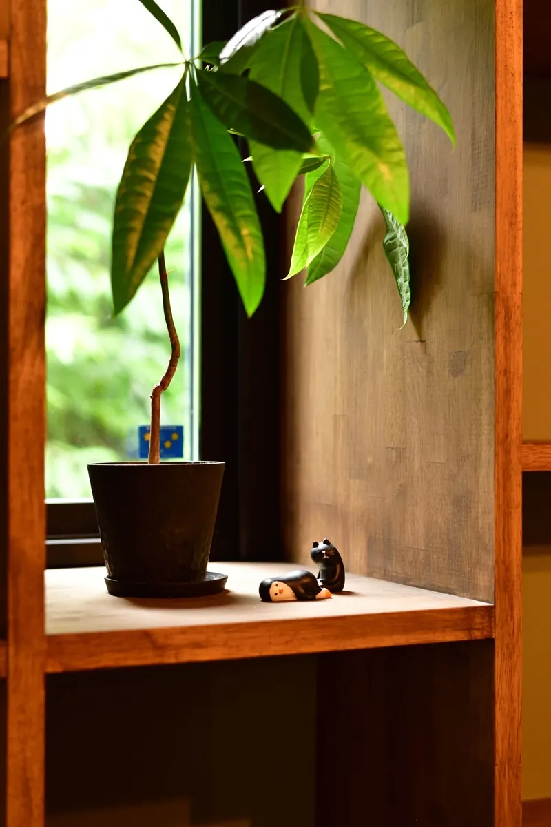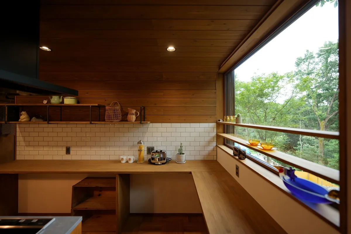カリフォルニアスタイルにOzashikiあり。畳の落ち着ける部屋が欲しいとのご要望で、Green Roomを干渉空間に置くことで各所のバランスを取りました。Livingとの対比で天井高さを低く抑えることでOzashikiがよりこもり感のある、座の空間になっています。間仕切りの建具は古建具を購入して大工さんのリメイクで取り付けました。