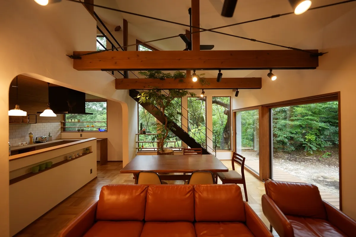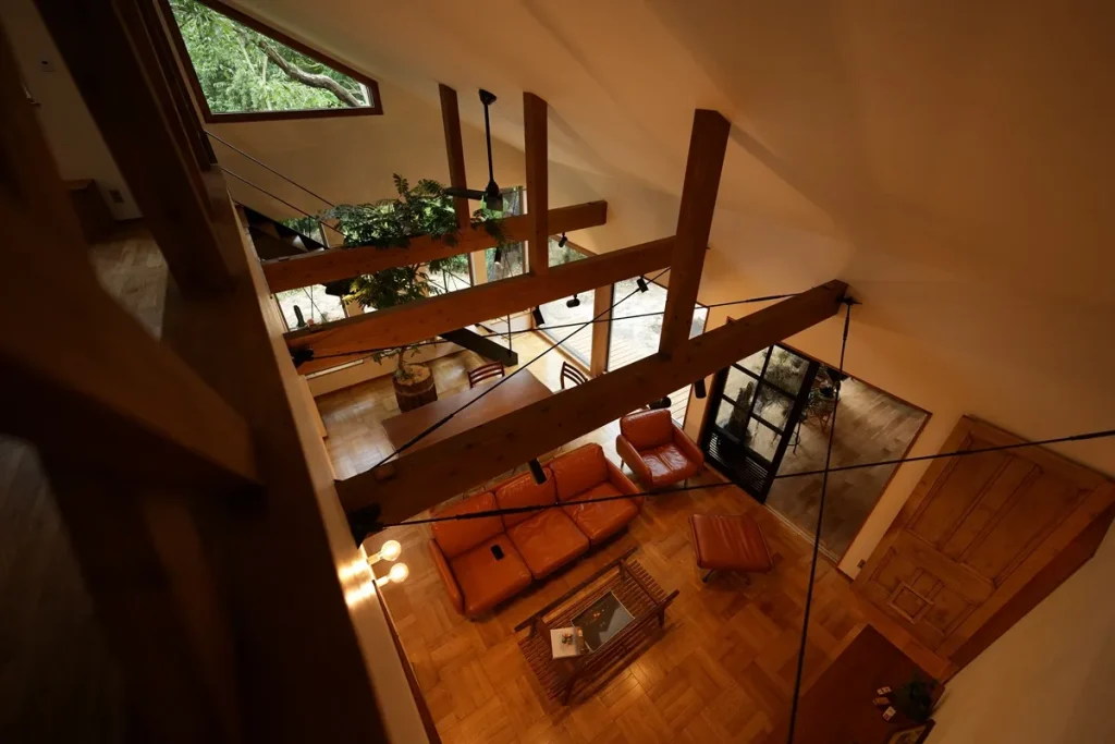 切妻の大屋根を活かして大きく吹き抜けたリビングです。更にその高さを活かしてお施主様が置いてくださった3mのエバーフレッシュがリビングを生き生きと魅せてくれます。床は市松模様に貼ったパーケットフロアを採用しました。昔の教室によく使われていた貼り方で、ヴィンテージハウスに馴染むフロアになりました。