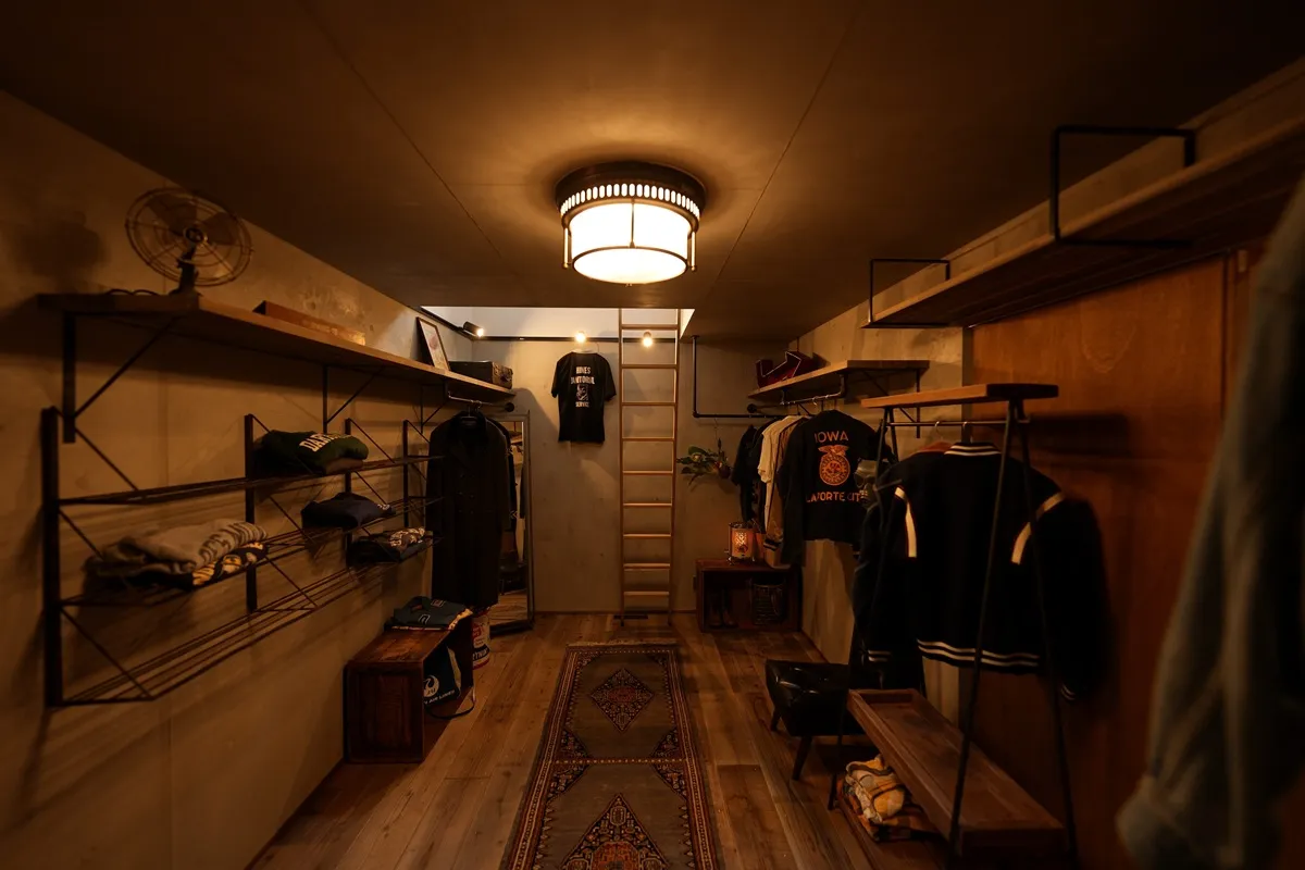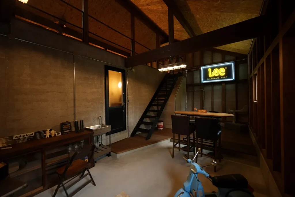 車を入れない、まさにVIPなGarageです。週末に車をいじったり、趣味の時間を過ごしたり、ご友人を招くご主人のお部屋です。このお部屋も居住空間よりは弱めですが断熱空間になっており、夏はエアコン、冬はストーブで快適に何時間でも過ごすことが出来ます。鉄扉にプロペラをアレンジしたドアロックや、鉄製の階段、耐力壁を兼ねた木毛セメント板の仕上げなど、こだわりが詰まったお気に入りの場所です。