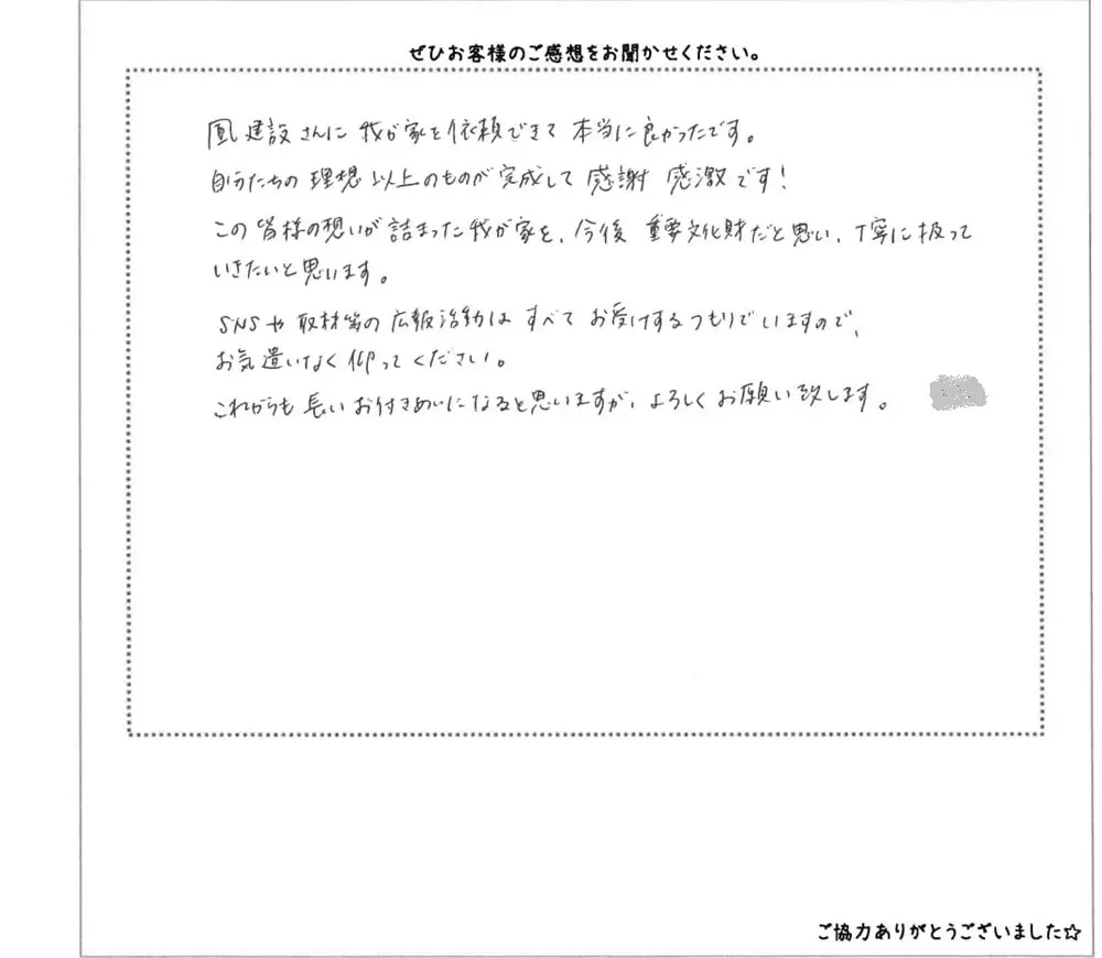 この皆様の想いが詰まった我が家を、今後重要文化財だと思い、丁寧に扱っていきたいと思います。